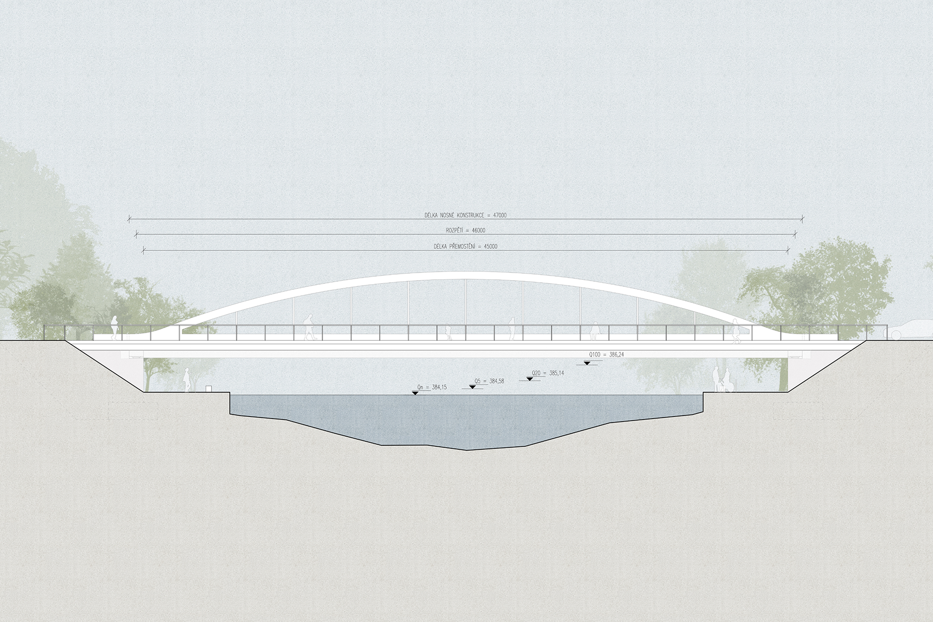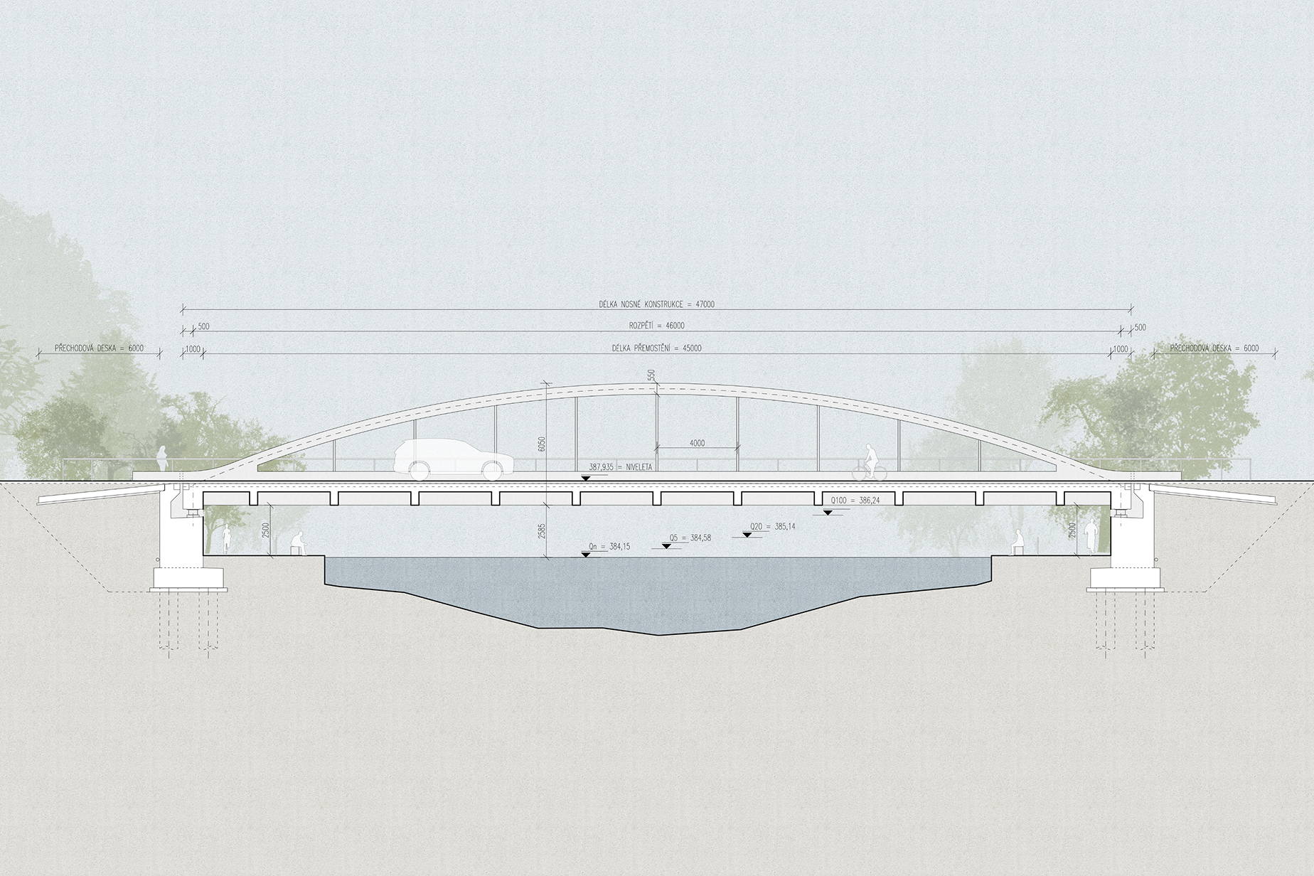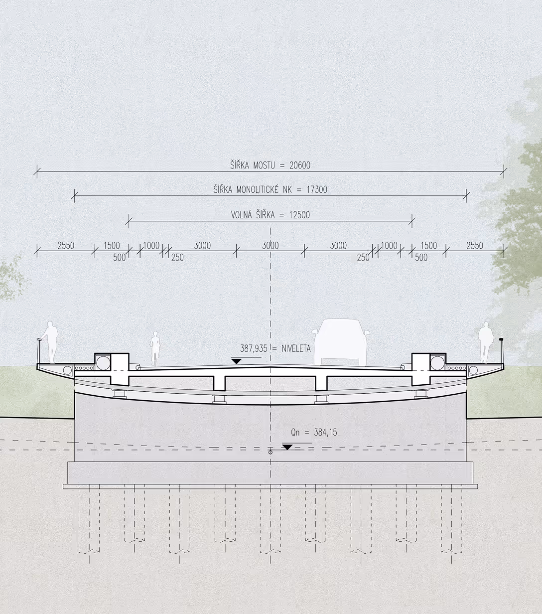 Návrh nového mostu přes Malši odstraňuje stávající mezilehlé pilíře, zvyšuje průtočnou kapacitu koryta a vytváří čistší, bezpečnější prostor pod mostem. Součástí návrhu je i komfortnější vedení cyklostezek přímo pod mostem a přímé napojení na městské trasy. Konstrukce kombinuje předpjatý železobeton s ocelovými táhly, což umožňuje štíhlou a elegantní siluetu s minimem překážek v řece.
