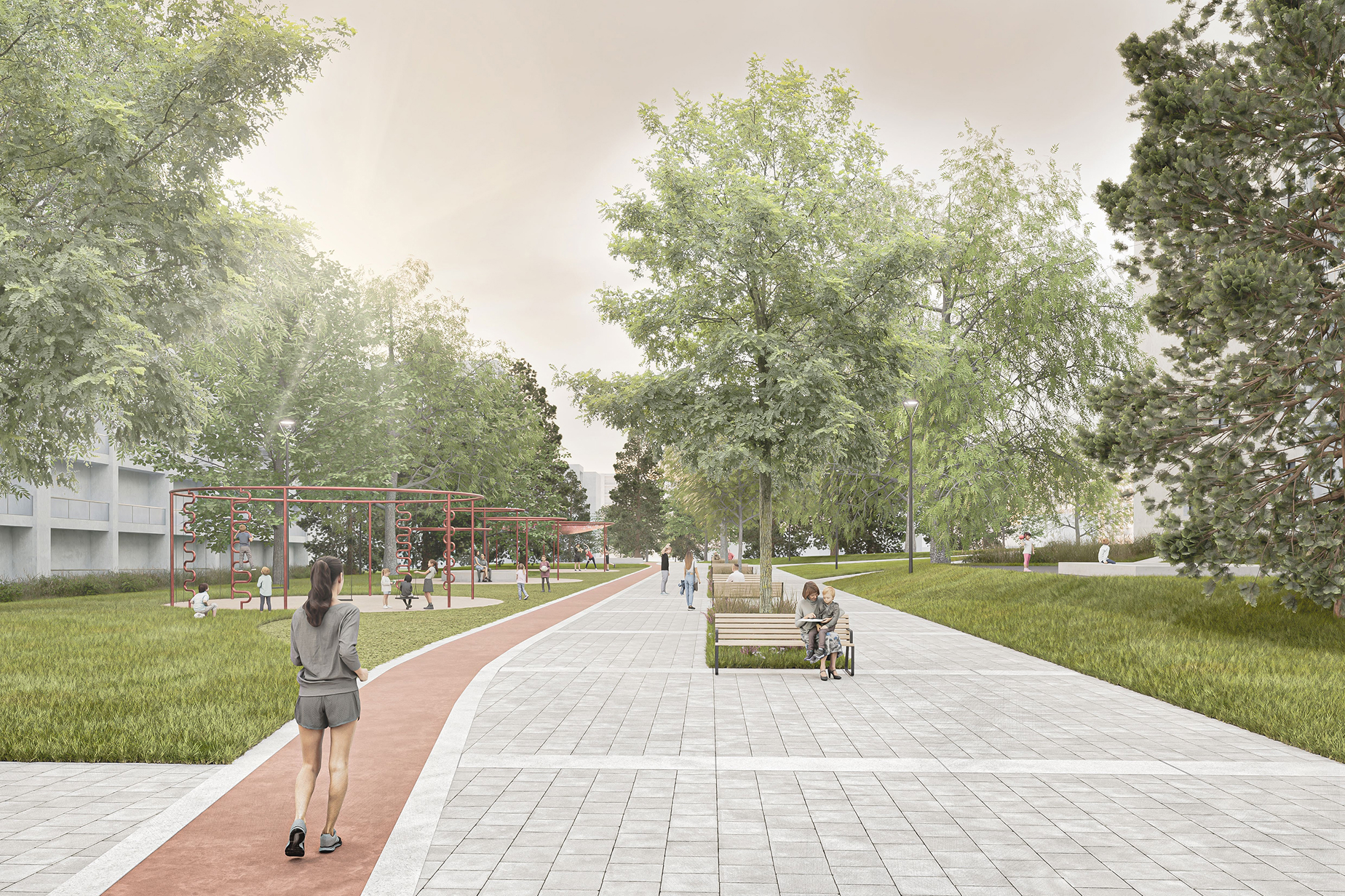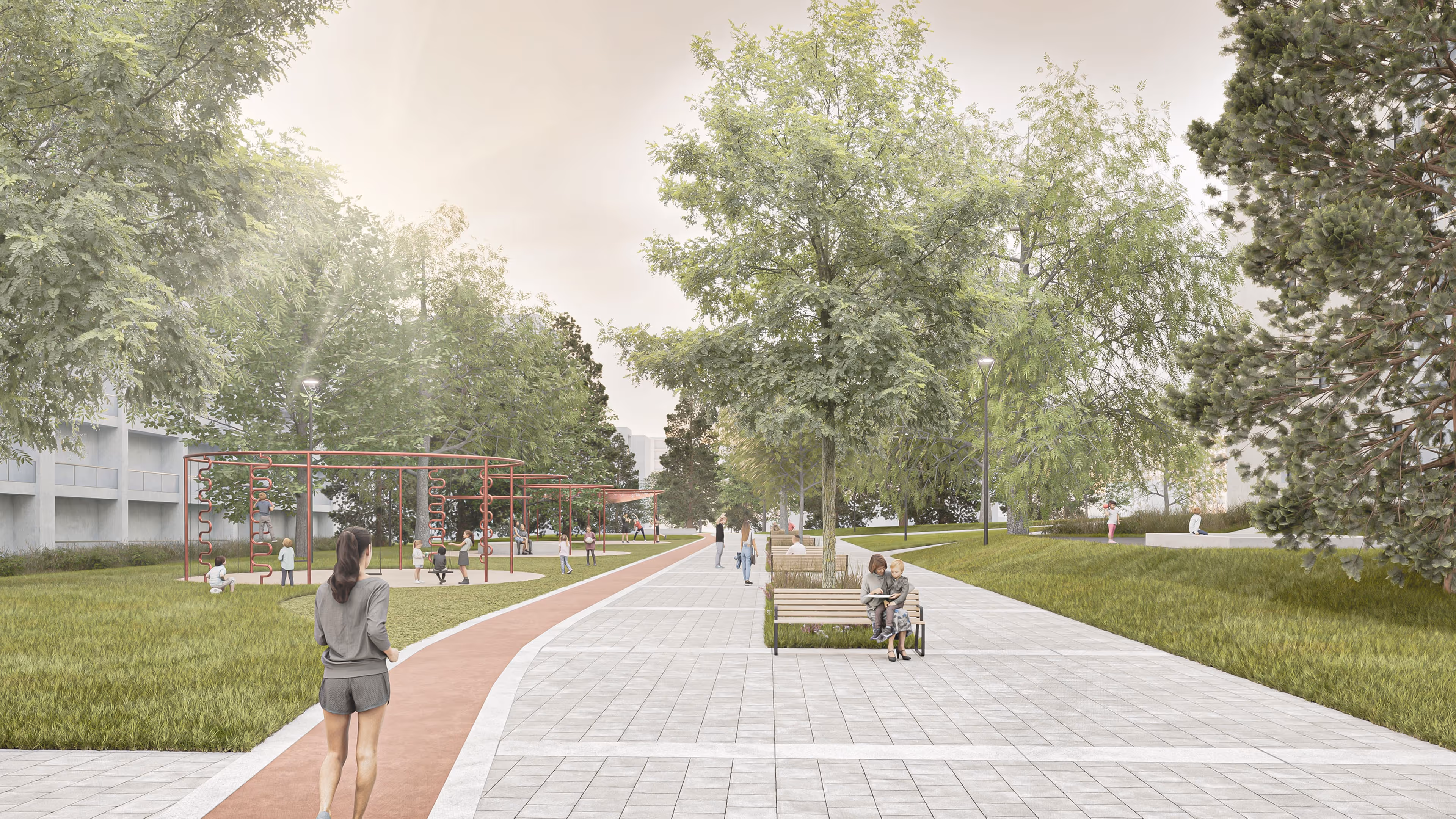 Revitalizace klade důraz na multifunkční využití prostoru. Vznikají místa pro klidný pobyt, hru, sport i komunitní aktivity, která reagují na potřeby různých věkových skupin. Součástí návrhu je nové lokální centrum s vodním prvkem, pobytovými plochami a návazností na venkovní fitness. Dětská hřiště jsou navržena jako autorské herní prvky s výtvarnou hodnotou, které přispívají k nové identitě místa a zároveň podporují bezpečné a podnětné prostředí pro hru.