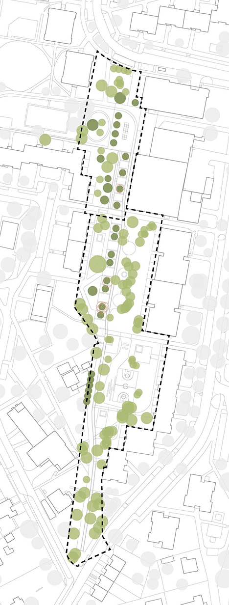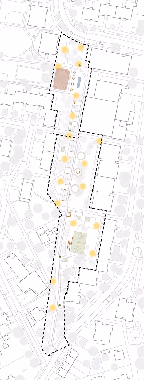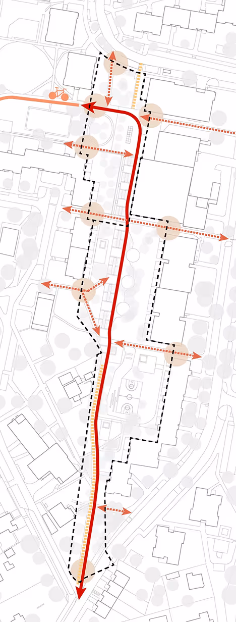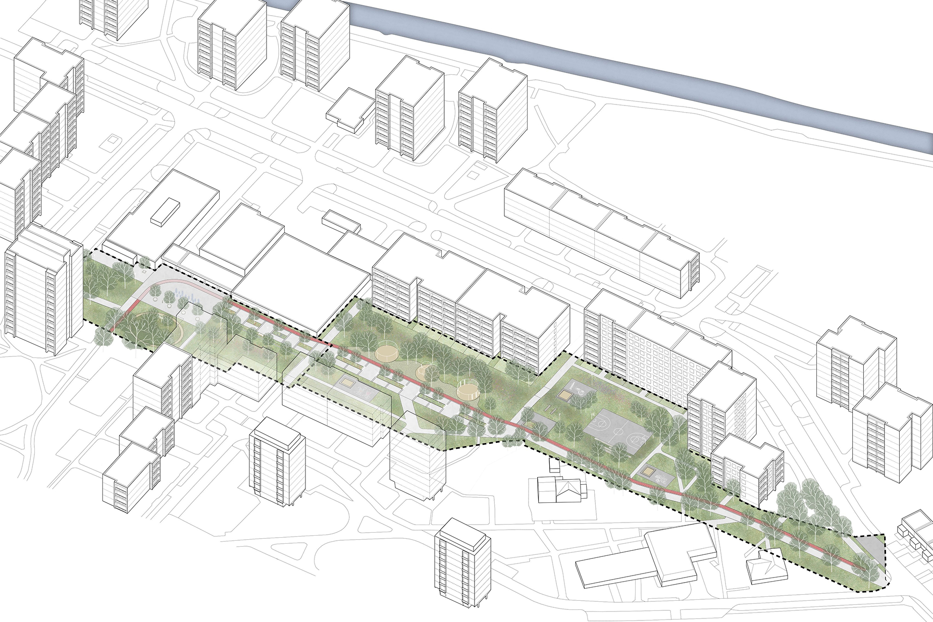 Návrh vychází z kultivace stávající struktury sídliště a posiluje přirozené pohybové vazby, které zde obyvatelé dlouhodobě využívají. Klíčovým prvkem je nová spojovací linie v podobě pěší a cyklistické trasy, která propojuje tři hlavní pobytová ohniska – lokální centrum, dětská hřiště a sportovní plochy. Tato linie není pouze komunikační trasou, ale také aktivním veřejným prostorem, který podporuje pohyb, orientaci a spontánní setkávání v rámci celého území.
