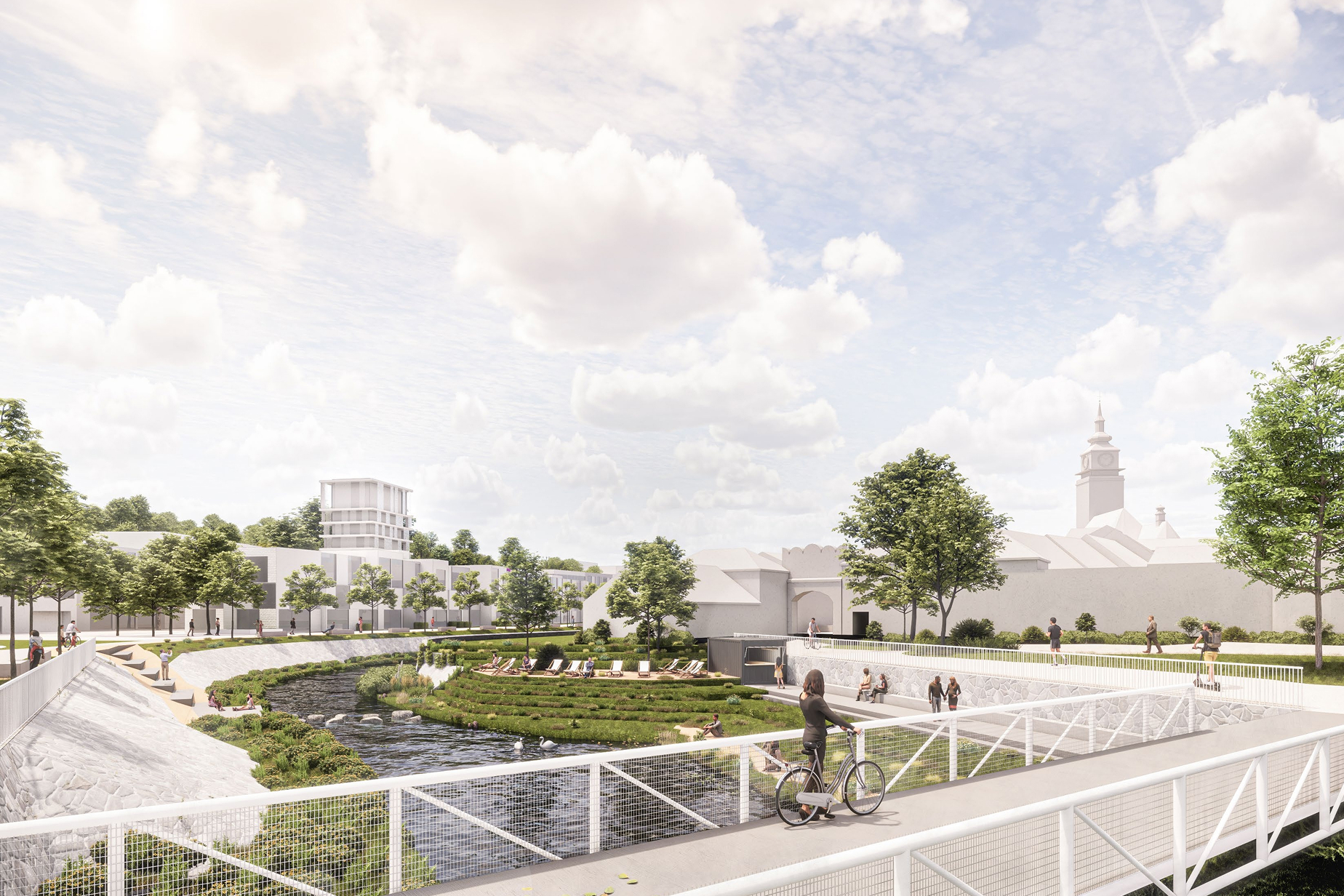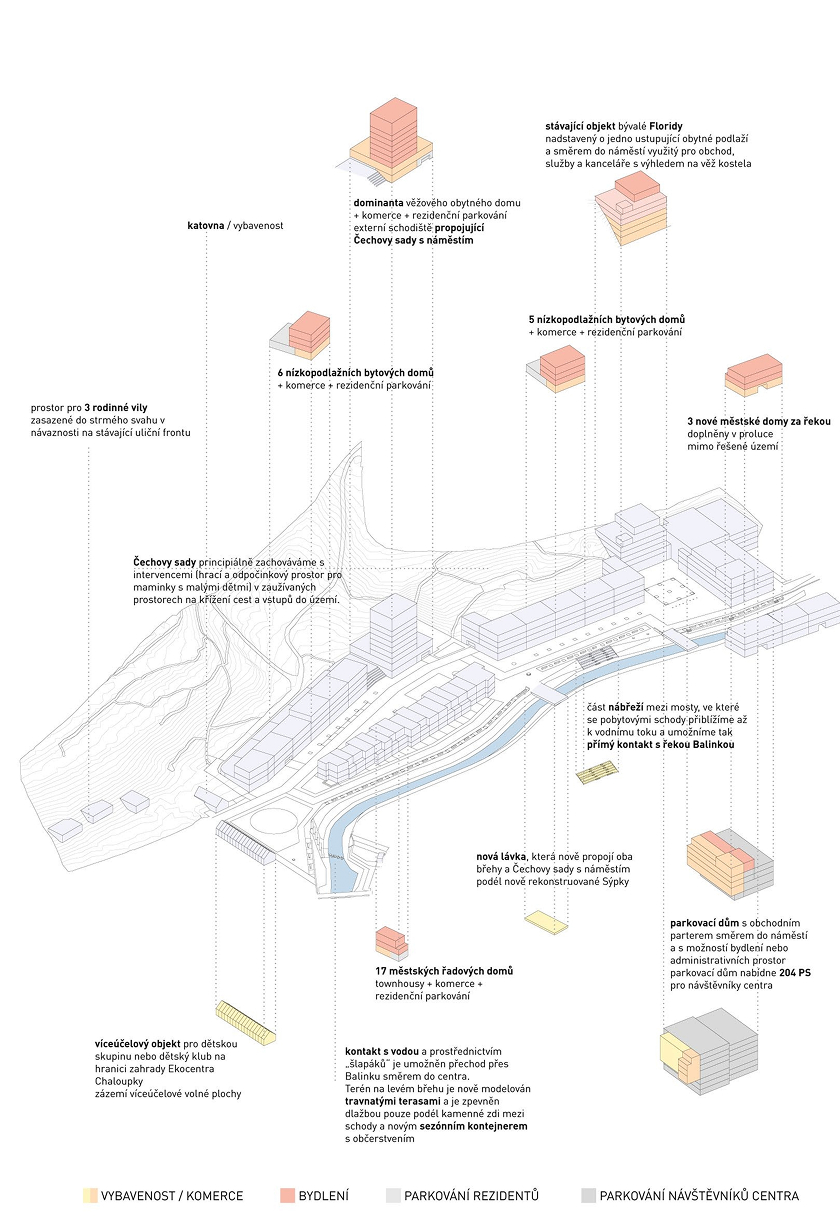 Řeka Balinka se stává hlavním prostorotvorným prvkem území. Pravý břeh je navržen jako souvislé městské nábřeží s proměnlivým charakterem – od klidných pobytových úseků se stínem stromů až po živé části s přímým kontaktem s vodou. Pobytové schody, lávka propojující oba břehy a návaznost na Čechovy sady posilují pěší prostupnost a propojují nové centrum s okolními částmi města.